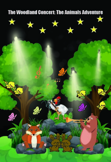 Bring the magic of the forest to life with "The Woodland Concert: The Animals Adventure" poster! This enchanting illustration captures a whimsical nighttime concert scene featuring a variety of adorable woodland animals performing in the forest under a starlit sky. The vibrant artwork includes a rooster singing with passion, a bear joyfully playing a trumpet, a fox and bunnies watching the show, and cheerful yellow birds adding harmony from the trees. The lush green foliage and spotlight effect create an immersive, lively atmosphere, perfect for children's rooms, classrooms, or nature-themed spaces. This poster inspires imagination and a love for nature in kids and animal lovers alike, making it an ideal gift or decor piece.
